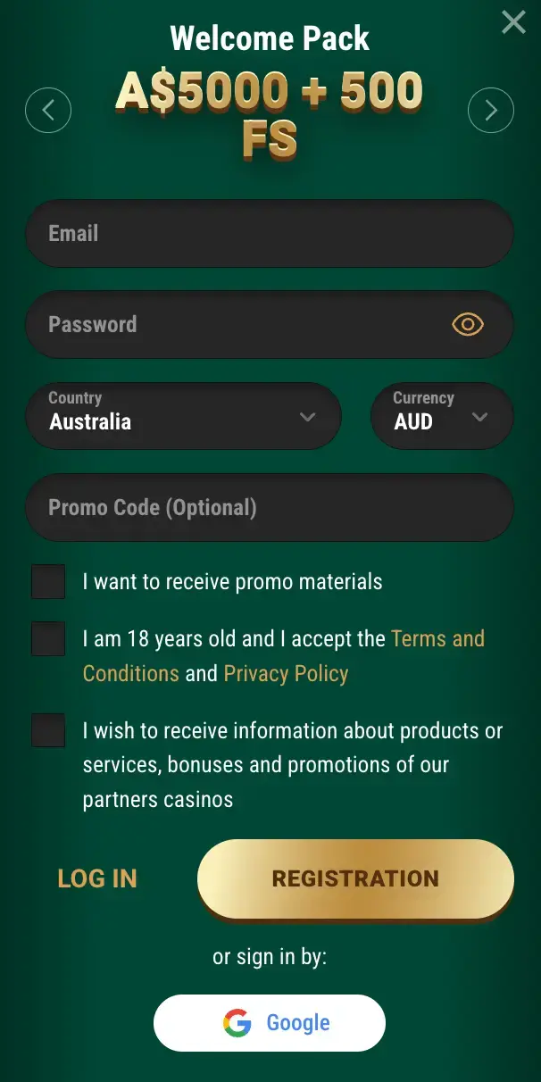 | 1. Registration | Click the “Sign Up” button. Enter name, date of birth, email, phone and choose AUD as currency. Accept terms and conditions. |